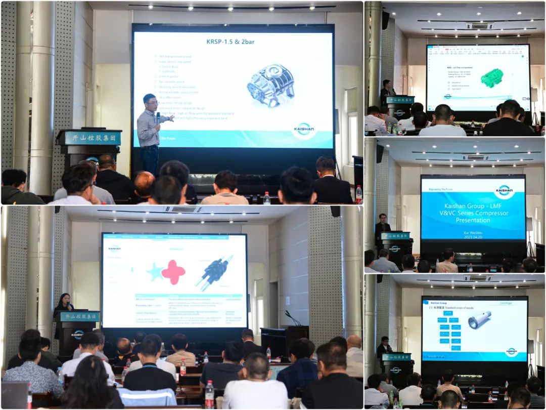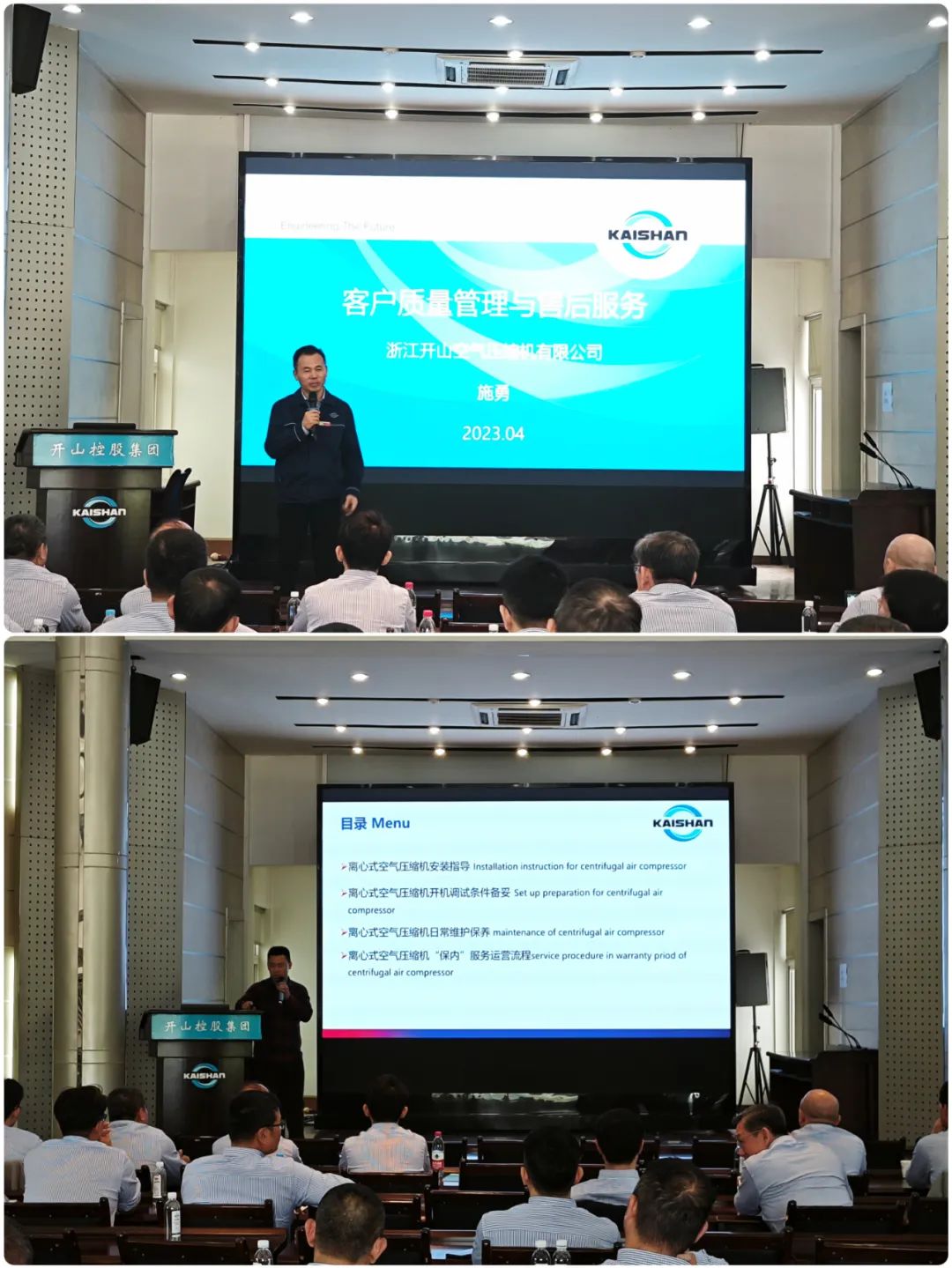 浙江开山压缩机有限公司质量总监施勇做了开山传统螺杆产品海外市场的支持流程和质量提升流程汇报,开山服务(上海)有限公司总经理杨辙做了离心机、PET等产品海外市场服务管理及服务培训。
